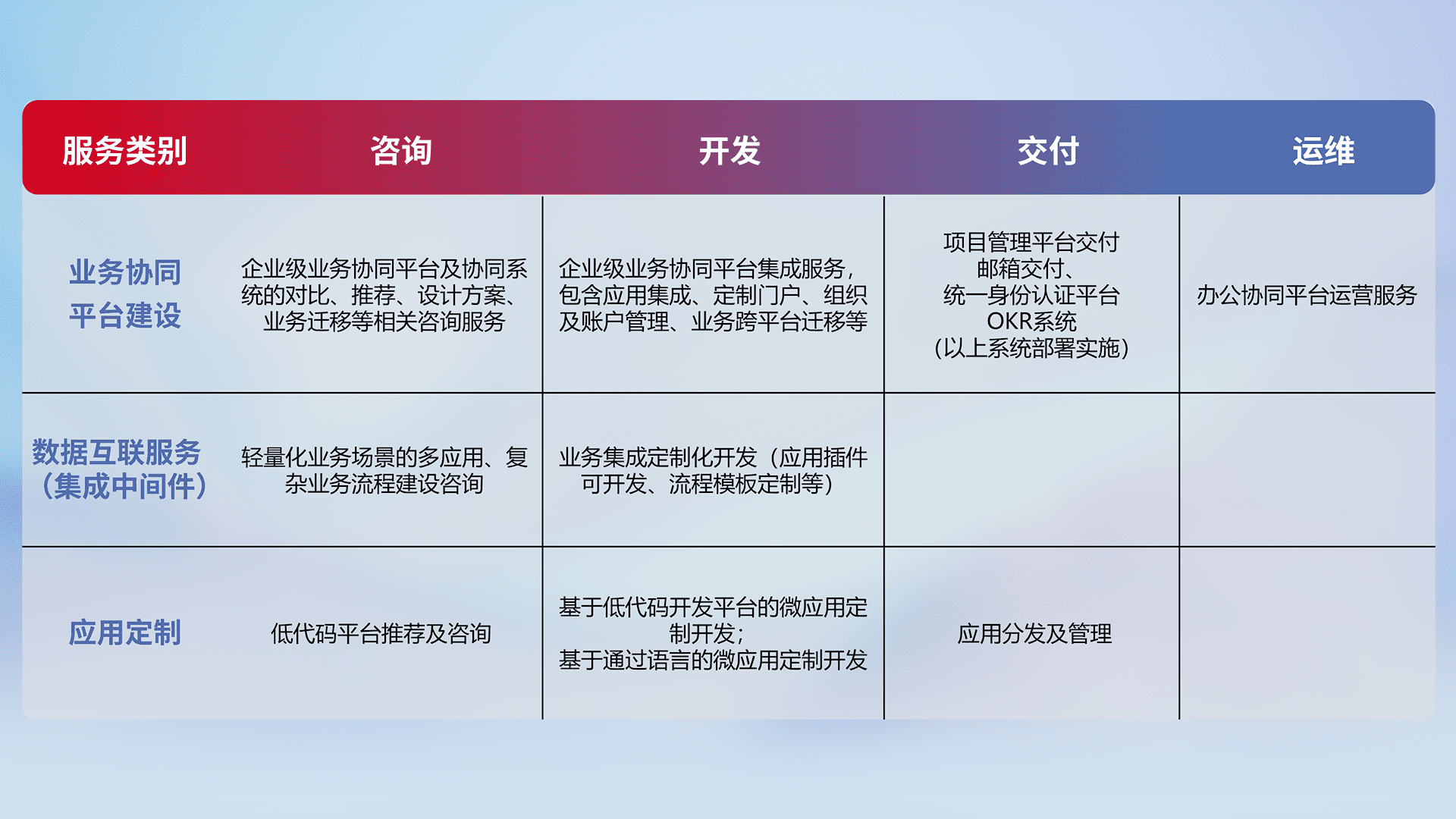 针对钉钉、、企微、、、、IDaas等平台级产品提供产品的规划、、方案、、、、交付、、、定制化开发等服务,,,,实现如统一协同办公、、、智能客户服务、、、混合会议管理、、、智能数据查询、、、等业务场景,,,,实现数字化转型。。